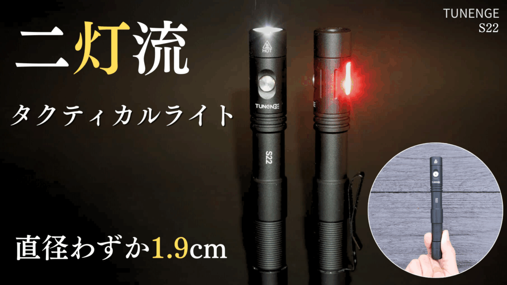 今回新たに登場した、コンパクトタクティカルライト『S22』の特徴のひとつがメインとサイド2つの光源を搭載。細見ボディながら圧倒的な照射力。メインライトは暗闇もしっかり照らす高性能LED